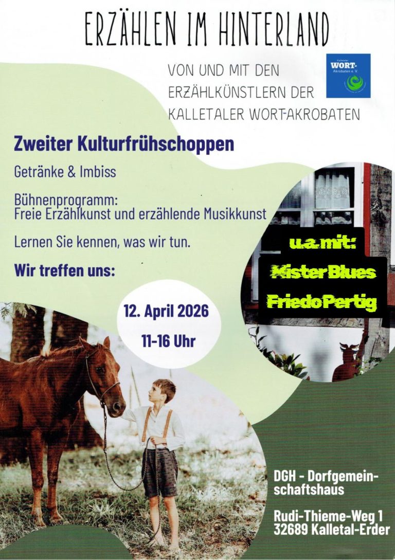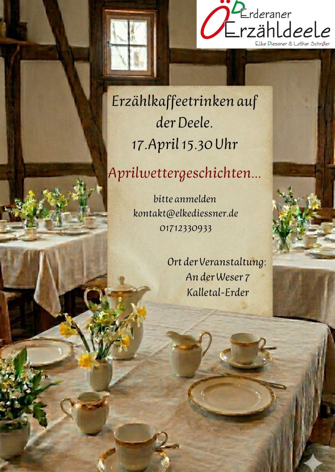 Auch 2026 öffnen Elke Dießner und Lothar Schröer wieder weit die Türen der Erderaner Erzähldeele für all jene Menschen, die Freude an guter Erzählkunst haben. Das Deelenerzählen bei Kaffee und Kuchen etabliert sich immer mehr und bietet eine schöne, entspannte Atmosphäre, die das Erleben frei erzählter Geschichten, Märchen, Mythen, Sagen und Legenden zum Genuss machen. Manchmal auch mit Live-Musik.