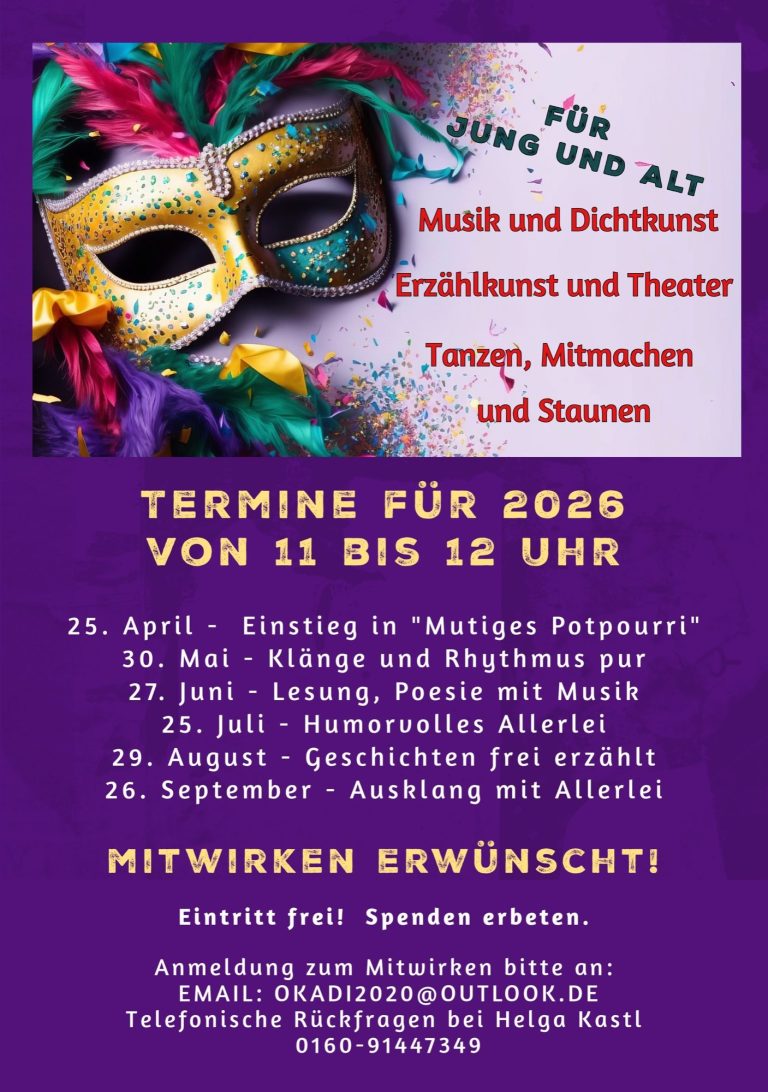 Für weitere Informationen und Anmeldungen zum Projekt „BÜHNE FREI ! für Allerlei“ bitte Helga Kastl kontaktieren.