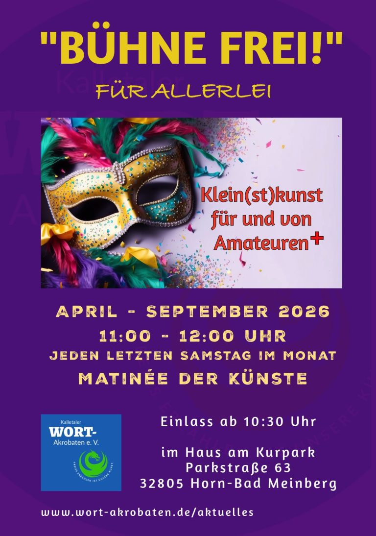 Es begann mit einem kleinen „Fest der Schönen Hüte“ gefolgt von Einladungen zu Schreib- und CrossArt-Workshops im „Offenen Atelier“ im Ballhaus. Durch inspirierende Erzählnachmittage, dem Projekt „Meeting of Generations“ vom Literaturbüro OWL und viel Bühnenerfahrung im Seniorenkabarett hat Helga Kastl, freie Künstlerin und WORT-Akrobatin das „BÜHNE FREI! für Allerlei“-Projekterfunden. Sie ist überzeugt, die Magie der Lebendigkeit helfe allen, wieder die eigene Kreativität schätzen zu lernen, Kairos eben. Sie hat kurzerhand Kulturschaffende dazu eingeladen, mitzumachen. Mehrere Amateure, auch einige geschätzte Profis aus dem heimischen Umfeld haben sich zusammengefunden, um ihre ureigenen Klein(st)kunst-Ideen gemeinsam auf die Bühne zu bringen – mitten im Herzen von Bad Meinberg.